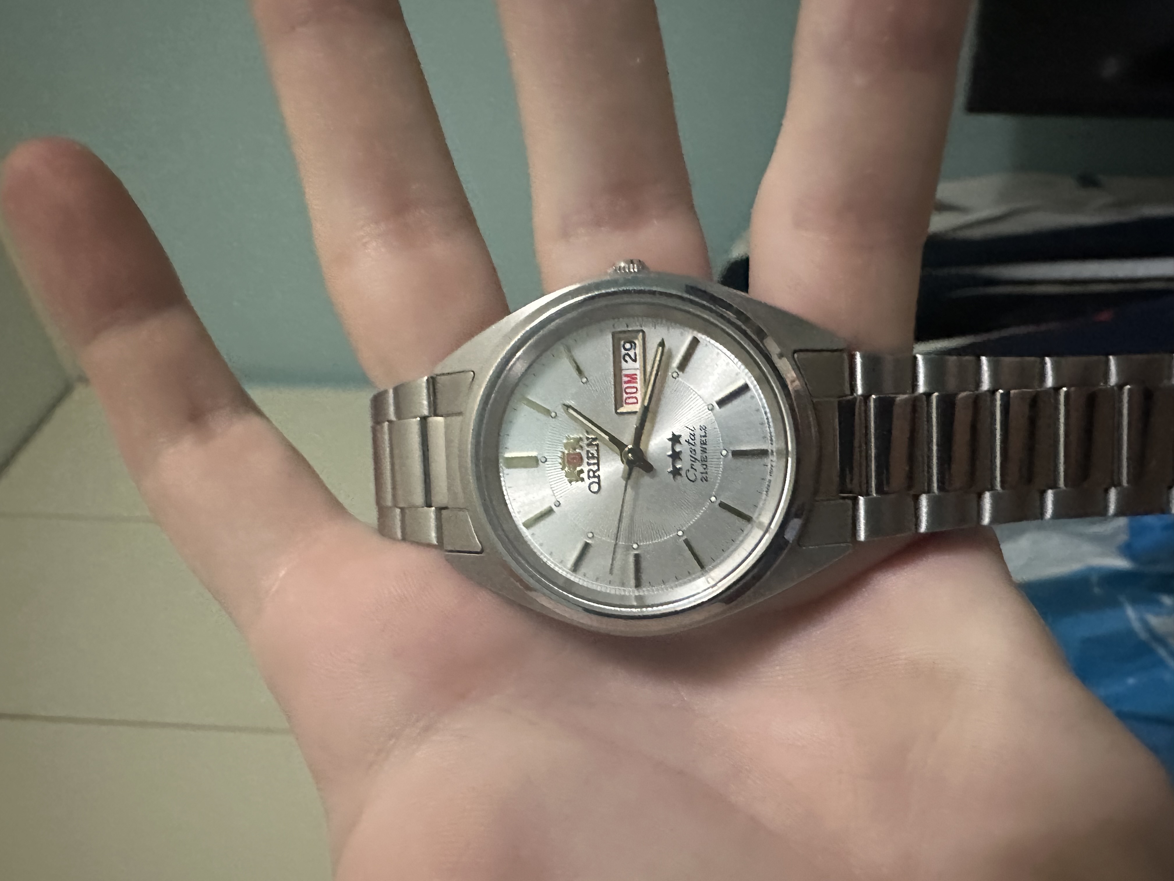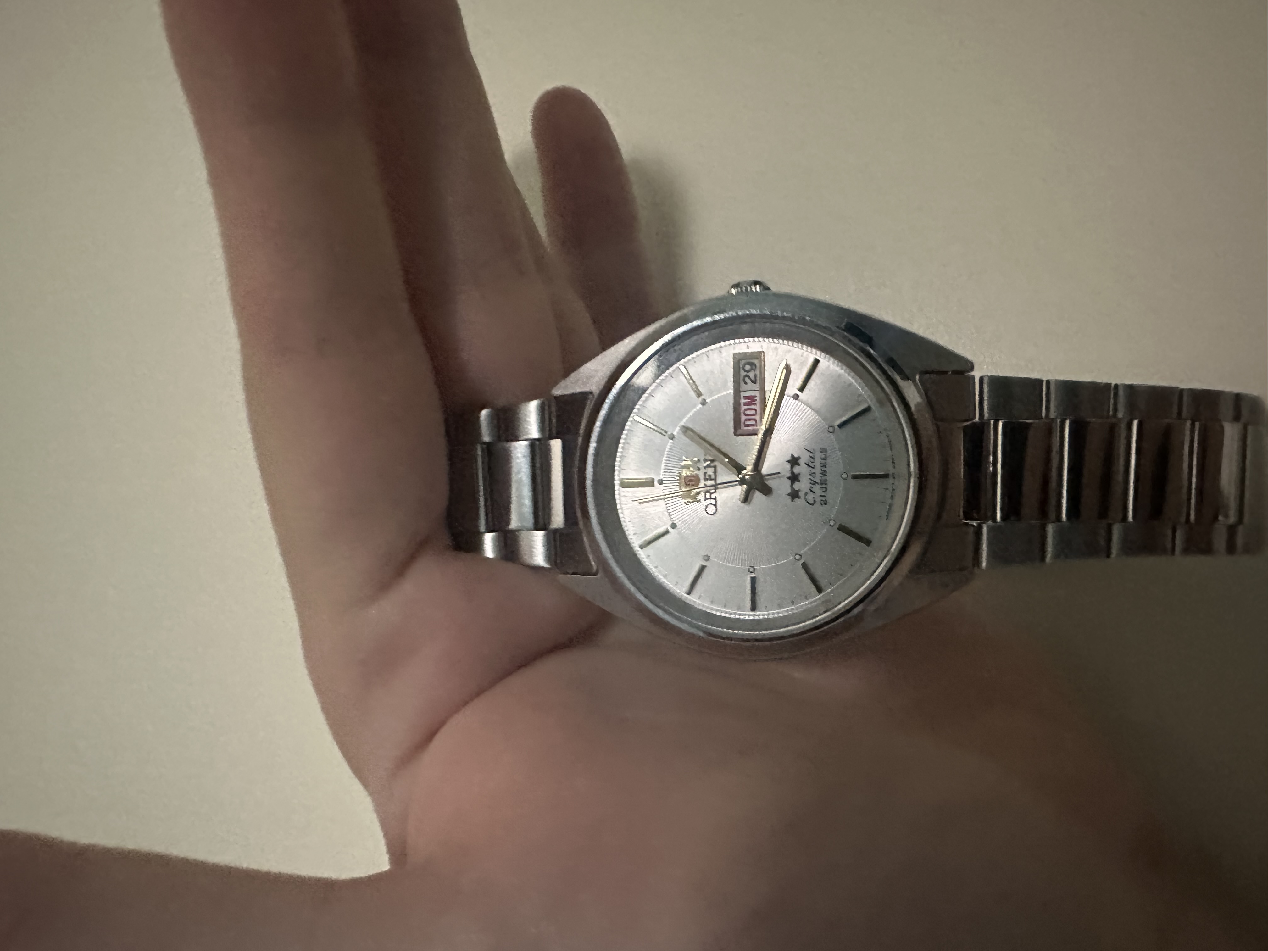 Το ρολόι είναι από την συλλογή του πατέρα μου είναι orient έχει μπρασελέ το καντράν είναι άσπρο και έχει χρυσούς δείκτες επισης είναι αυτόματο και αδιάβροχο είναι ένα κομψό και σοβαρό ρολόι που δεν φεύγει από την μόδα το ρολόι δίνεται χωρίς το κουτί για αυτό και η τιμή σε περίπτωση προσφοράς παρακαλώ να είναι σοβαρή